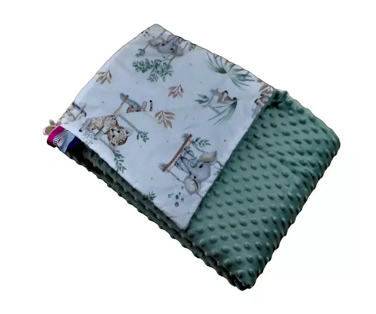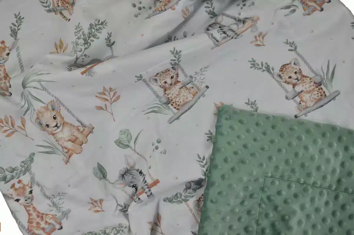 Kocyk MINKY wzór szałwia zwierzątka na huśtawce