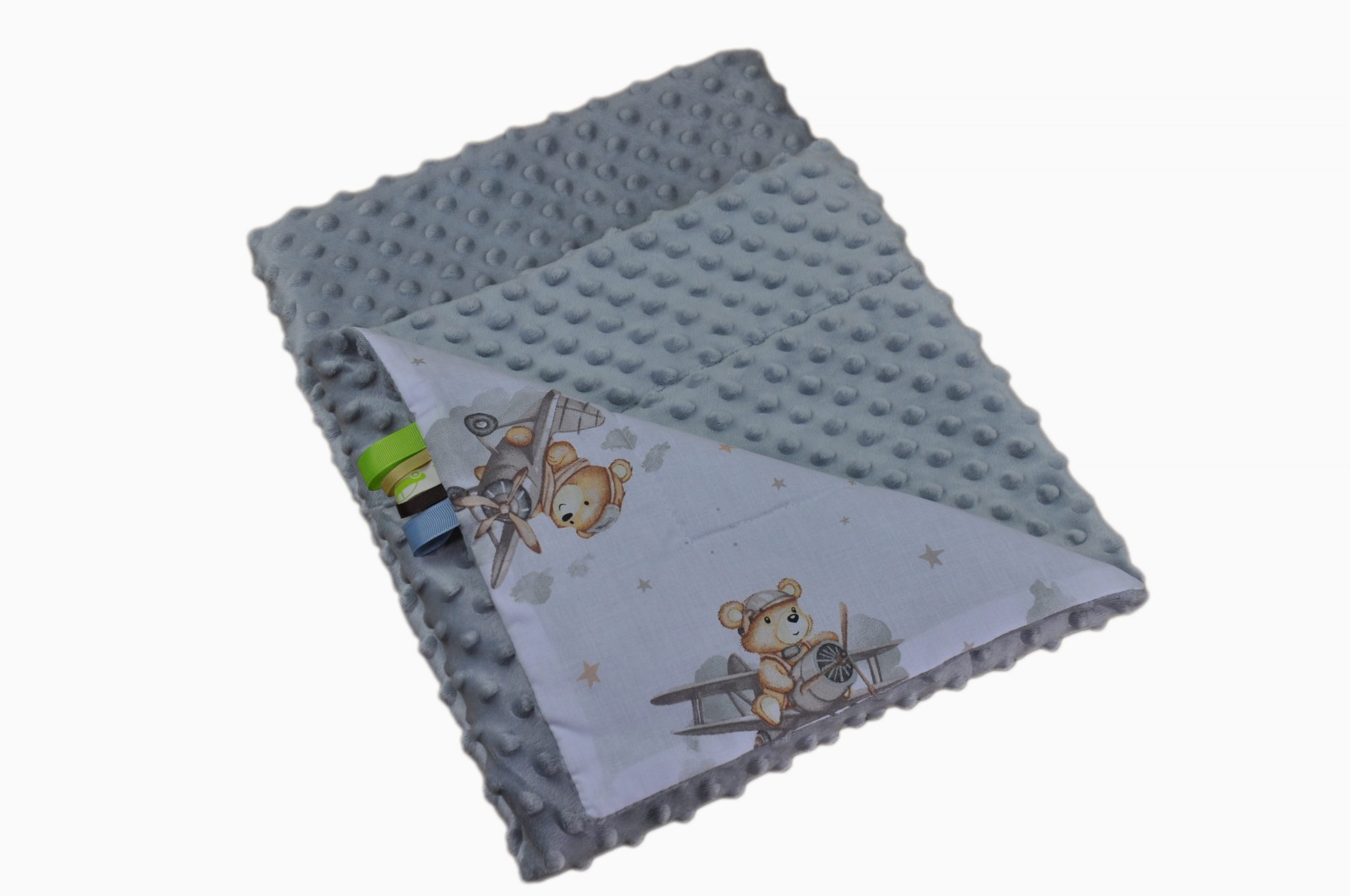 Kocyk MINKY wzór szare-miś-samolot-beż