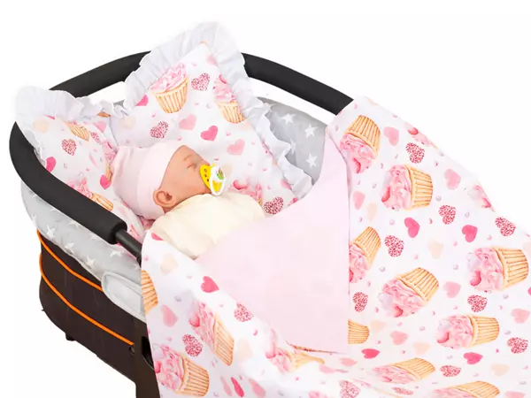 Dzięki zastosowaniu dwóch różnych wzorów tkanin, zestaw prezentuje się wyjątkowo uroczo – idealny zarówno do wózka, łóżeczka, jak i kosza Mojżesza.