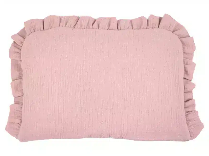 Niezwykle mięciutka i delikatna poduszka muślinowa uszyta ręcznie z naturalnej tkaniny bawełnianej, wewnątrz wszyta włóknina silikonowana, ozdobiona efektowną falbanką.
