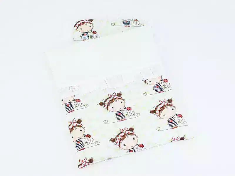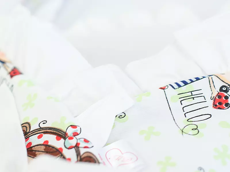 Do produkcji zestawu użyto wyłącznie tkanin posiadających certyfikat STANDARD 100 by OEKO-TEX®, co gwarantuje brak substancji szkodliwych i pełne bezpieczeństwo w kontakcie ze skórą dziecka. Kolorowa tkanina to 100% naturalna bawełna, przyjemna w dotyku i przewiewna. Wnętrze kołderki i poduszki wypełniono lekką, antyalergiczną włókniną silikonową o gramaturze 180 g/m², zapewniającą odpowiednią puszystość.