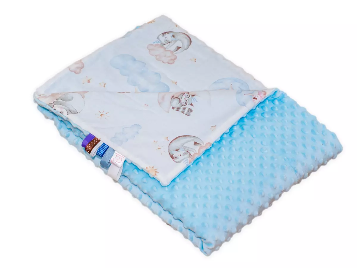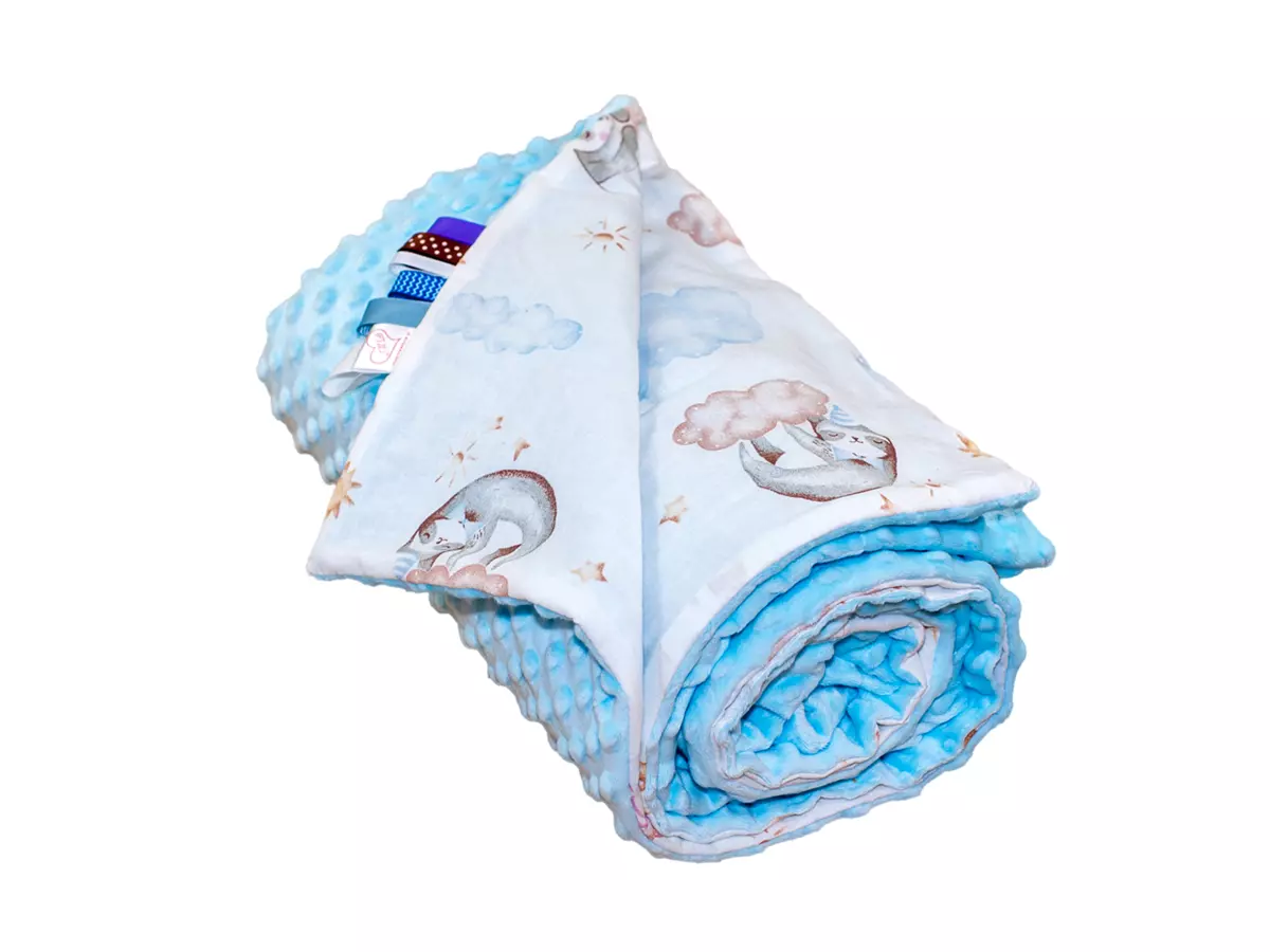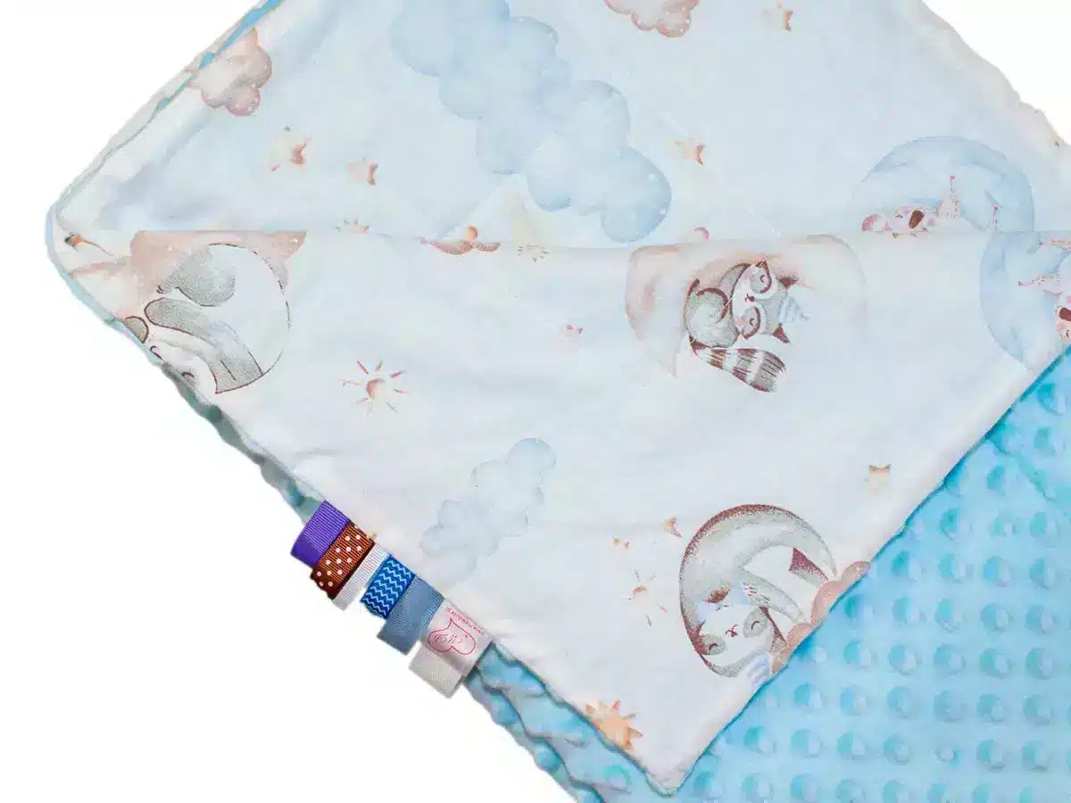 Kocyk 100×135 cm — dwustronny, z dwóch różnych faktur materiału: kolorowa, gęsta bawełna oraz miękka, delikatna dzianina minky o gramaturze 400 g/m². Wypełnienie to antyalergiczna, puszysta włóknina silikonowana o gramaturze 45 g/m².