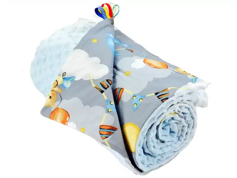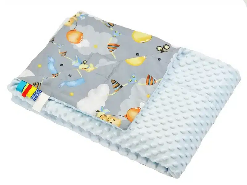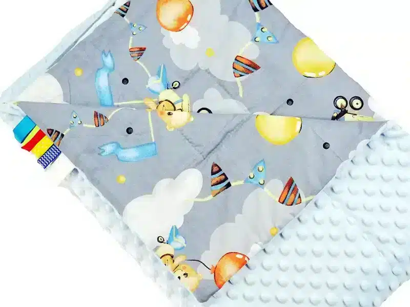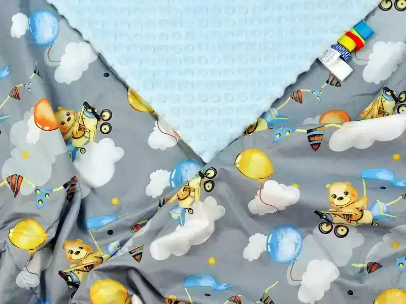 Kocyk 100×135 cm — dwustronny, z dwóch różnych faktur materiału: kolorowa, gęsta bawełna oraz miękka, delikatna dzianina minky o gramaturze 400 g/m². Wypełnienie to antyalergiczna, puszysta włóknina silikonowana o gramaturze 45 g/m².