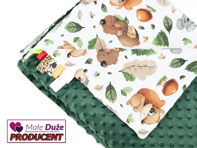 Kocyk 100×135 cm — dwustronny, z dwóch różnych faktur materiału: kolorowa, gęsta bawełna oraz miękka, delikatna dzianina minky o gramaturze 400 g/m². Wypełnienie to antyalergiczna, puszysta włóknina silikonowana o gramaturze 45 g/m².