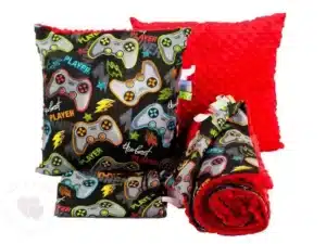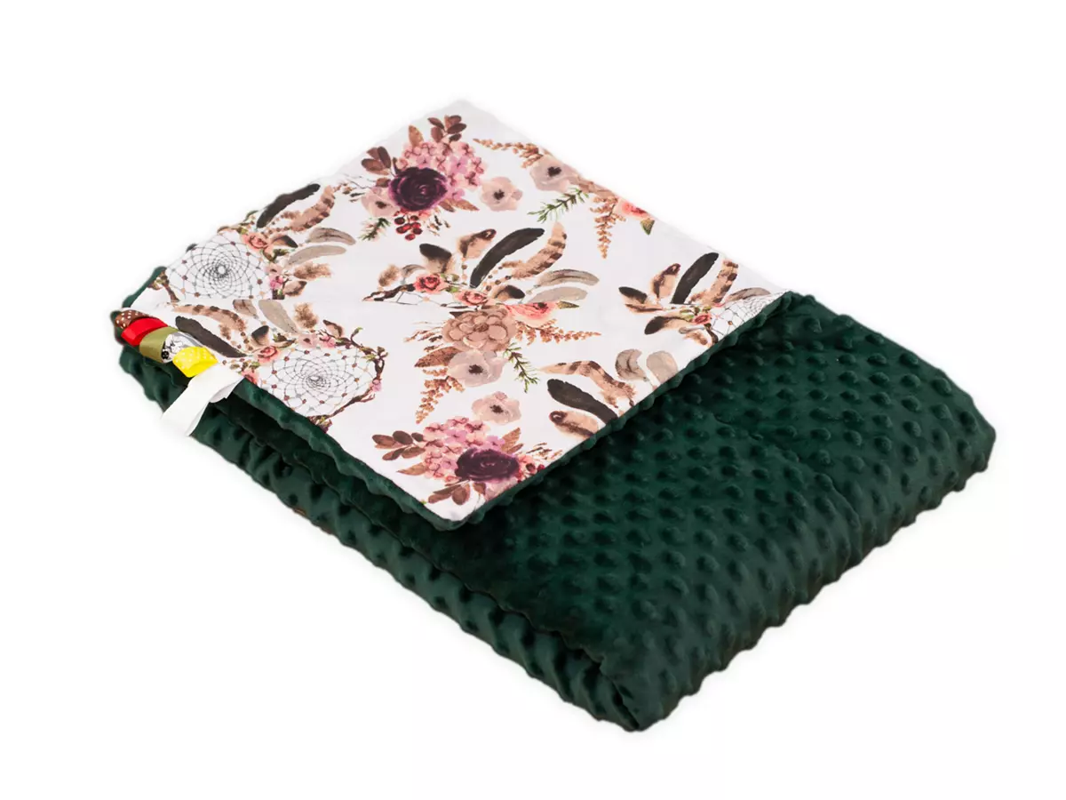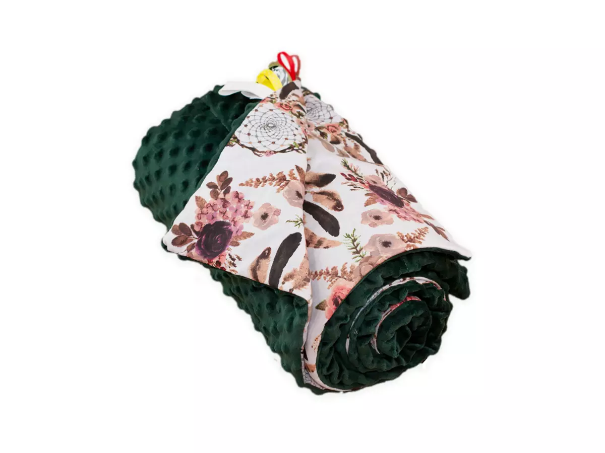 Kocyk 100×135 cm — dwustronny, z dwóch różnych faktur materiału: kolorowa, gęsta bawełna oraz miękka, delikatna dzianina minky o gramaturze 400 g/m². Wypełnienie to antyalergiczna, puszysta włóknina silikonowana o gramaturze 45 g/m².