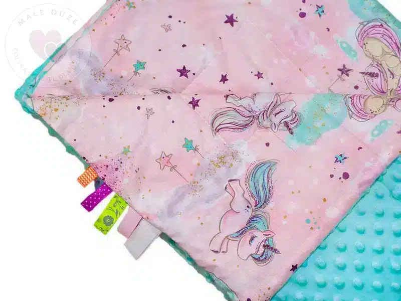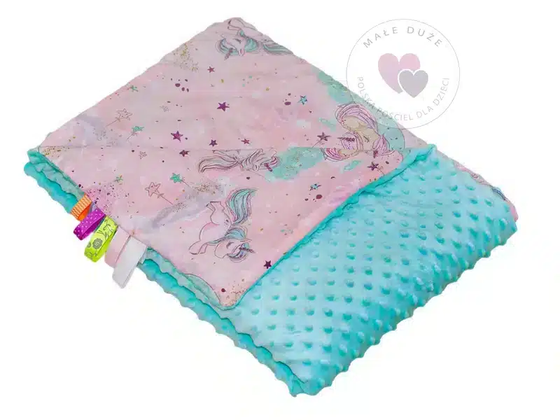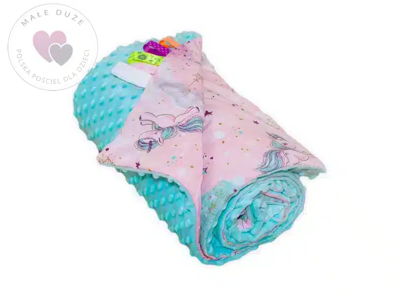 • Kocyk 100×135 cm — dwustronny, z dwóch różnych faktur materiału: kolorowa, gęsta bawełna oraz miękka, delikatna dzianina minky o gramaturze 400 g/m². Wypełnienie to antyalergiczna, puszysta włóknina silikonowana o gramaturze 45 g/m².