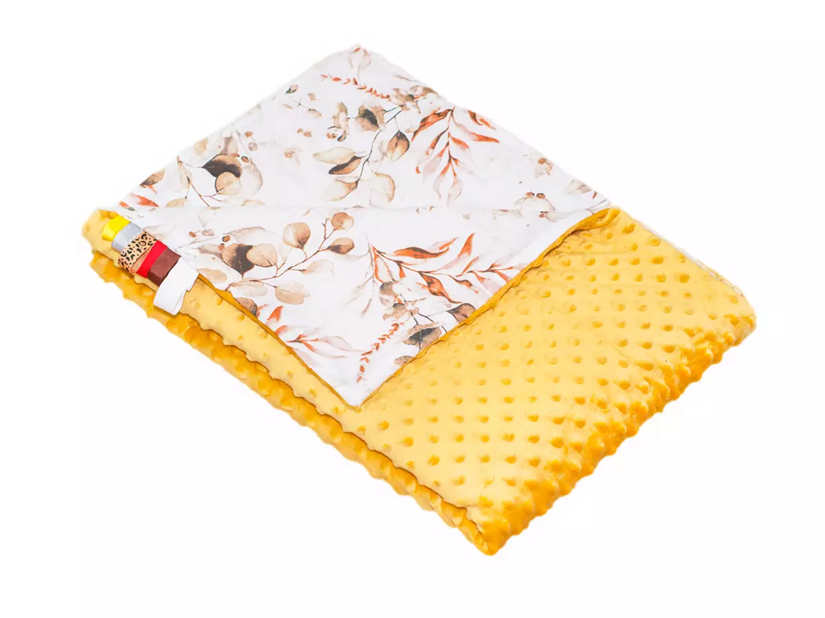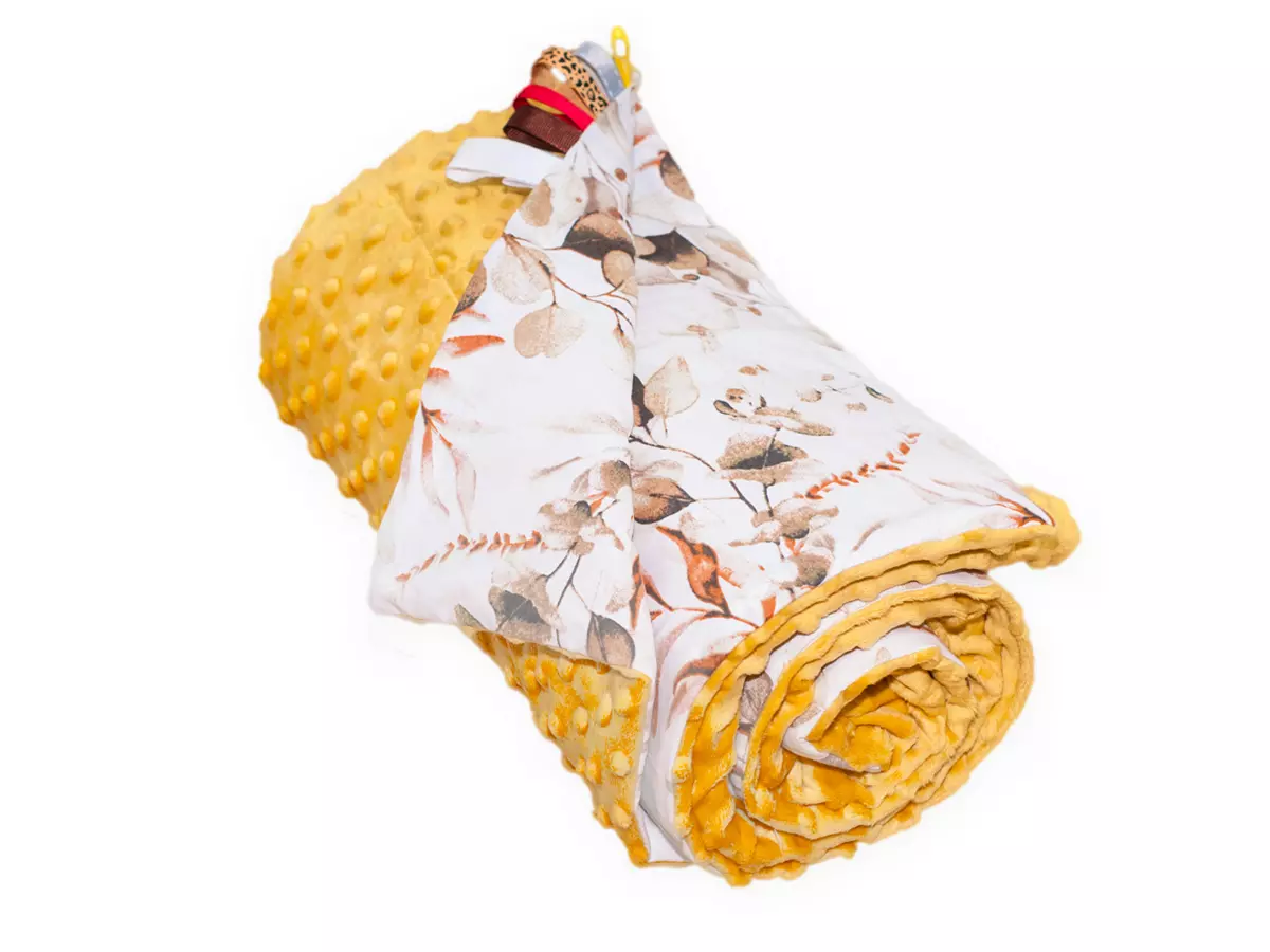 Kocyk 100×135 cm — dwustronny, z dwóch różnych faktur materiału: kolorowa, gęsta bawełna oraz miękka, delikatna dzianina minky o gramaturze 400 g/m². Wypełnienie to antyalergiczna, puszysta włóknina silikonowana o gramaturze 45 g/m².