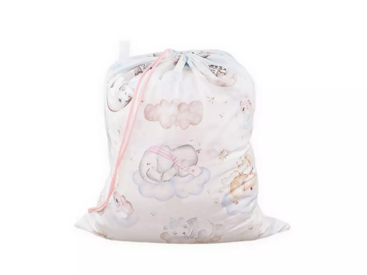 Worek na pościel 50×60 cm — bawełniany, w tym samym wzorze co pościel, ściągany sznureczkiem, z możliwością noszenia na ramieniu. Na worku można wyhaftować imię lub krótki napis (maksymalnie 2 słowa, obszar 200×200 mm).