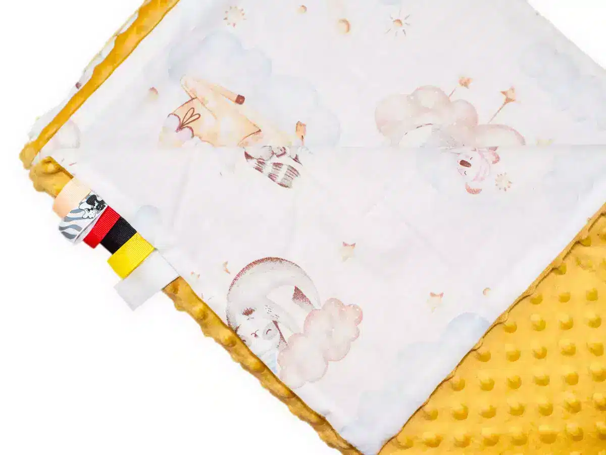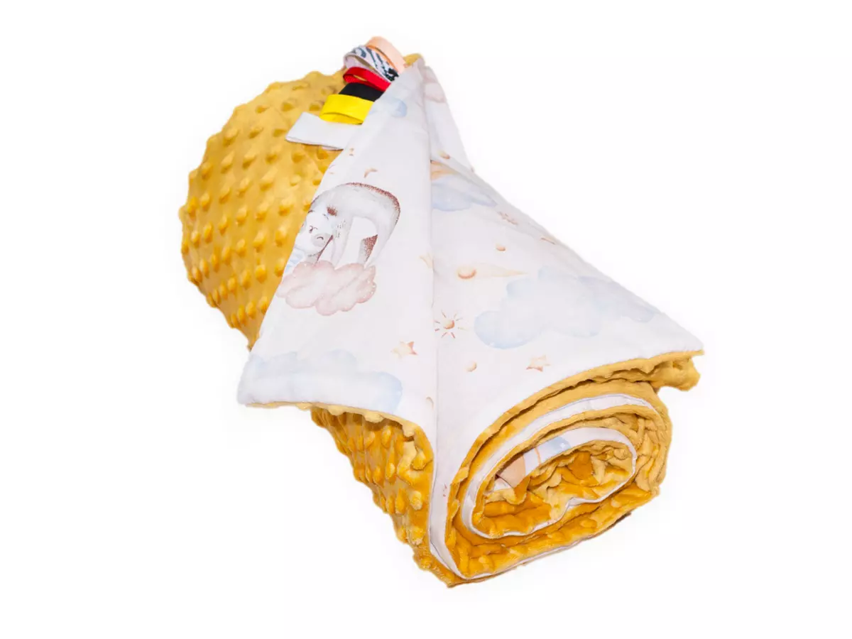 Kocyk 100×135 cm — dwustronny, z dwóch różnych faktur materiału: kolorowa, gęsta bawełna oraz miękka, delikatna dzianina minky o gramaturze 400 g/m². Wypełnienie to antyalergiczna, puszysta włóknina silikonowana o gramaturze 45 g/m².