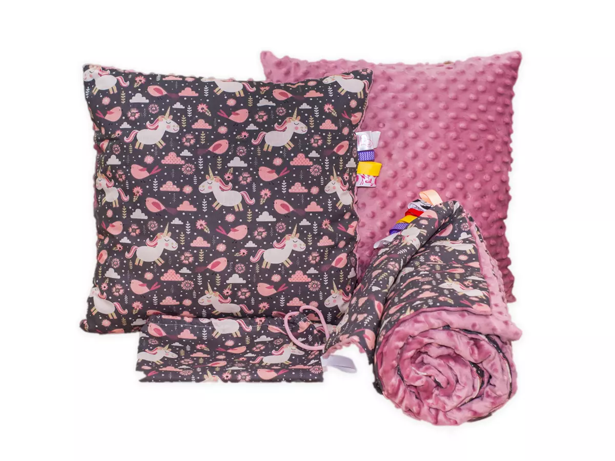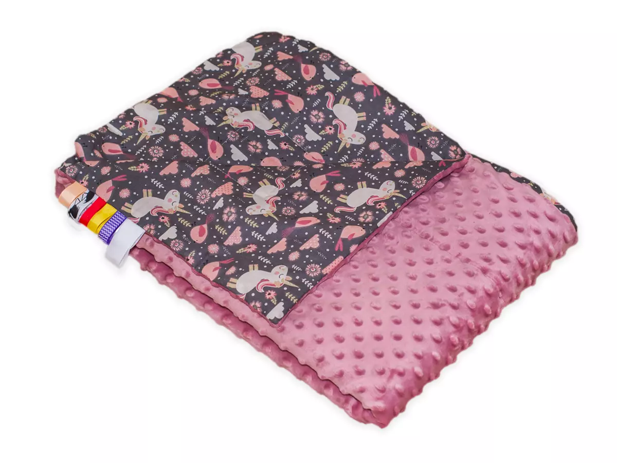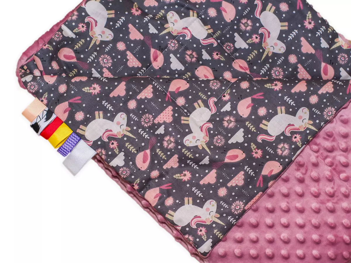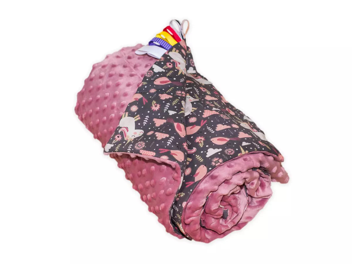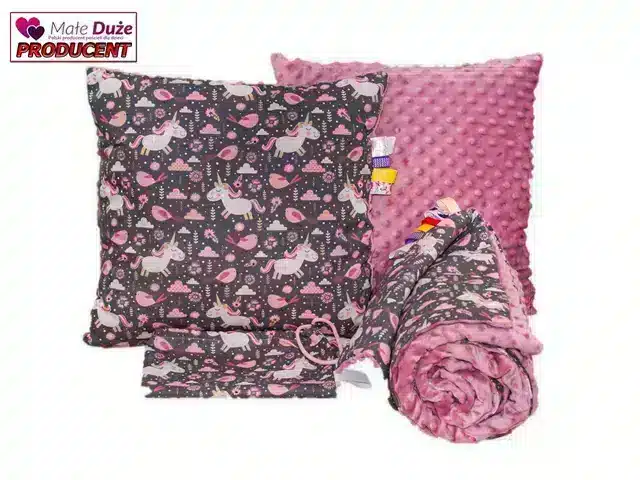 • Kocyk 100×135 cm — dwustronny, z dwóch różnych faktur materiału: kolorowa, gęsta bawełna oraz miękka, delikatna dzianina minky o gramaturze 400 g/m². Wypełnienie to antyalergiczna, puszysta włóknina silikonowana o gramaturze 45 g/m².