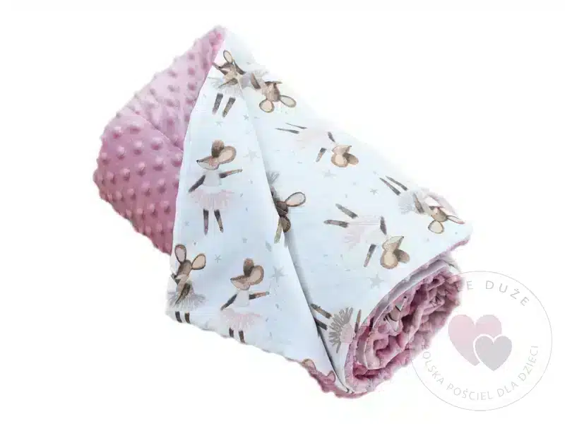 Kocyk 100×135 cm — dwustronny, z dwóch różnych faktur materiału: kolorowa, gęsta bawełna oraz miękka, delikatna dzianina minky o gramaturze 400 g/m². Wypełnienie to antyalergiczna, puszysta włóknina silikonowana o gramaturze 45 g/m².