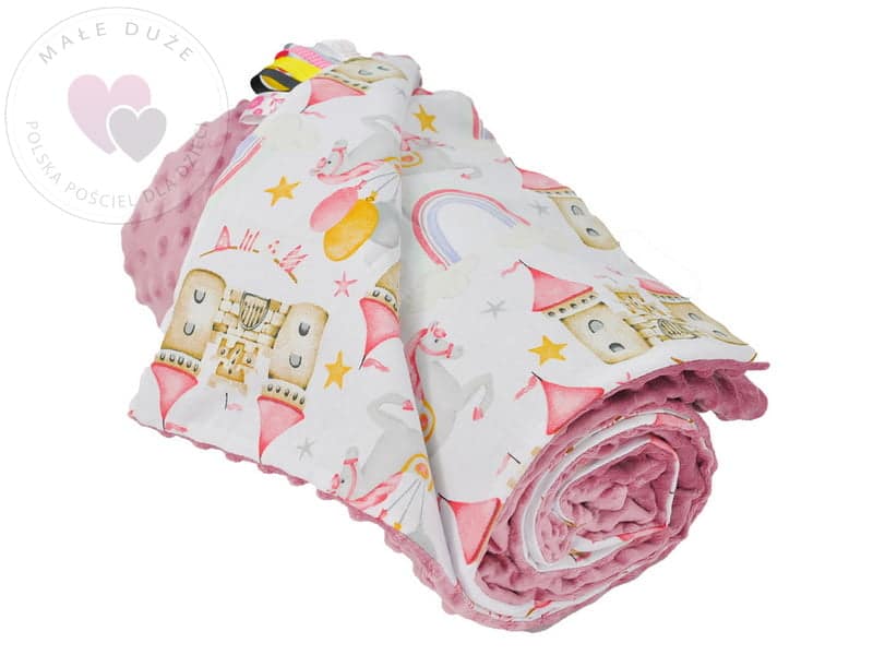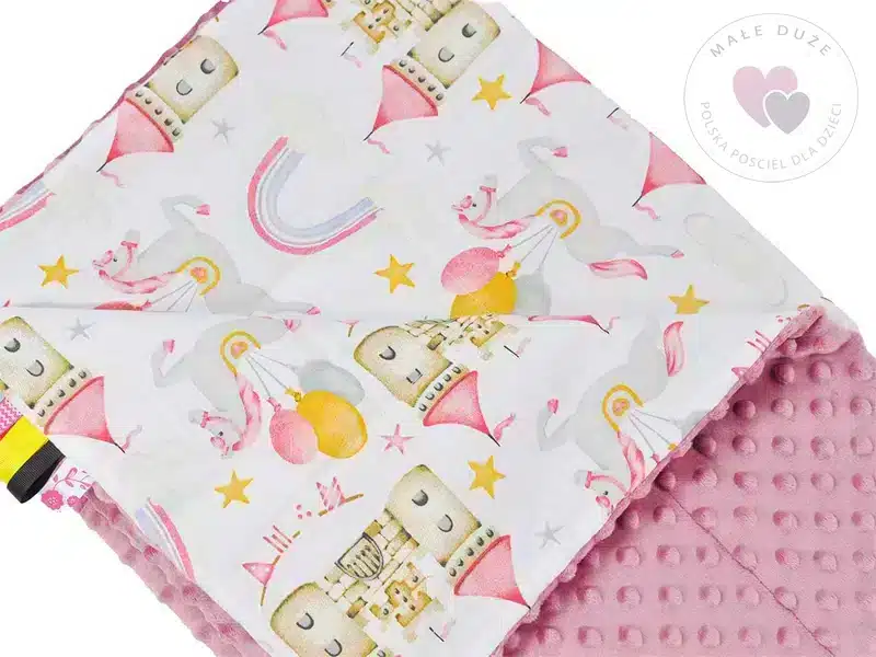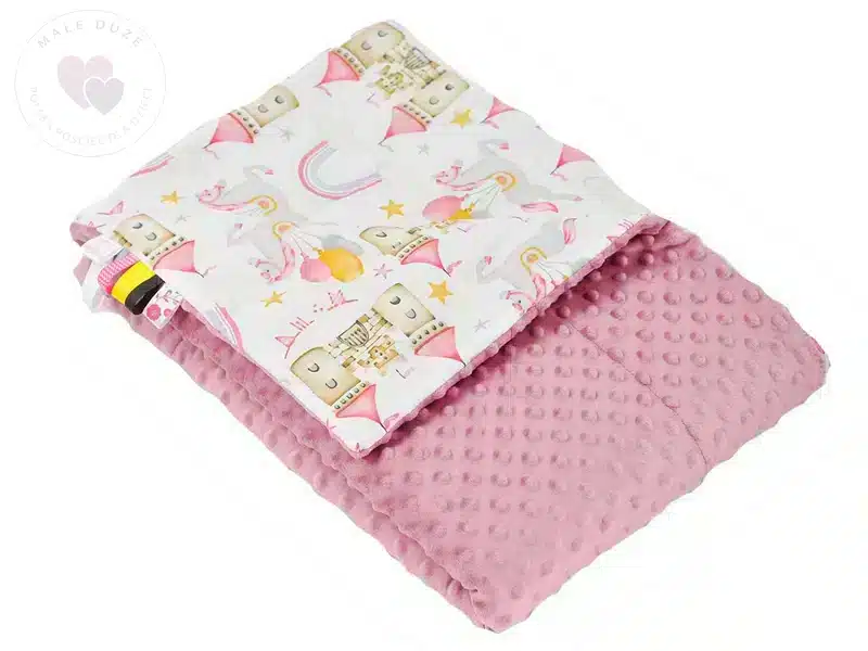 Kocyk 100×135 cm — dwustronny, z dwóch różnych faktur materiału: kolorowa, gęsta bawełna oraz miękka, delikatna dzianina minky o gramaturze 400 g/m². Wypełnienie to antyalergiczna, puszysta włóknina silikonowana o gramaturze 45 g/m².