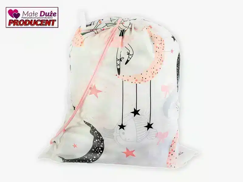 Worek na pościel 50×60 cm — bawełniany, w tym samym wzorze co pościel, ściągany sznureczkiem, z możliwością noszenia na ramieniu. Na worku można wyhaftować imię lub krótki napis (maksymalnie 2 słowa, obszar 200×200 mm).