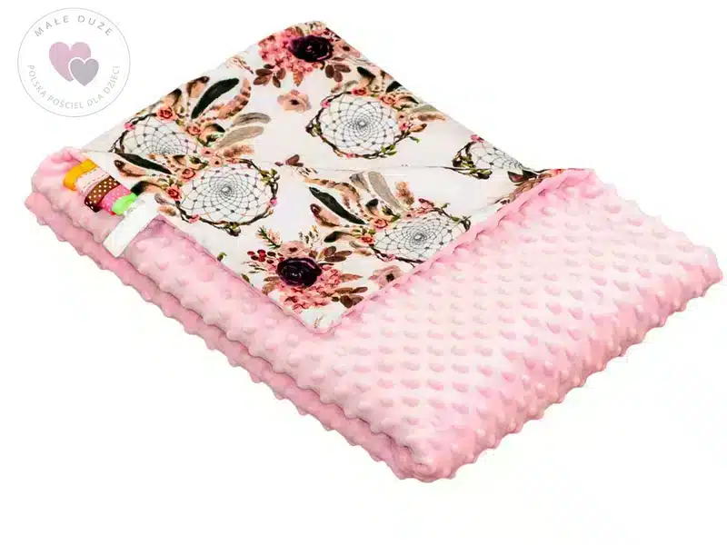 Kocyk 100×135 cm — dwustronny, z dwóch różnych faktur materiału: kolorowa, gęsta bawełna oraz miękka, delikatna dzianina minky o gramaturze 400 g/m². Wypełnienie to antyalergiczna, puszysta włóknina silikonowana o gramaturze 45 g/m².