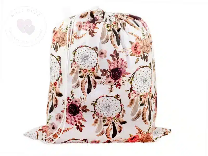 Worek na pościel 50×60 cm — bawełniany, w tym samym wzorze co pościel, ściągany sznureczkiem, z możliwością noszenia na ramieniu. Na worku można wyhaftować imię lub krótki napis (maksymalnie 2 słowa, obszar 200×200 mm).