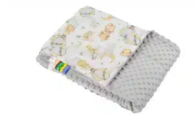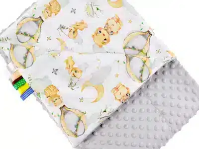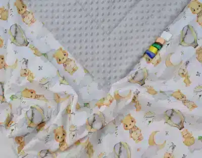 Kocyk 100×135 cm — dwustronny, z dwóch różnych faktur materiału: kolorowa, gęsta bawełna oraz miękka, delikatna dzianina minky o gramaturze 400 g/m². Wypełnienie to antyalergiczna, puszysta włóknina silikonowana o gramaturze 45 g/m².