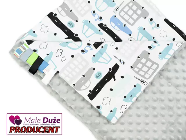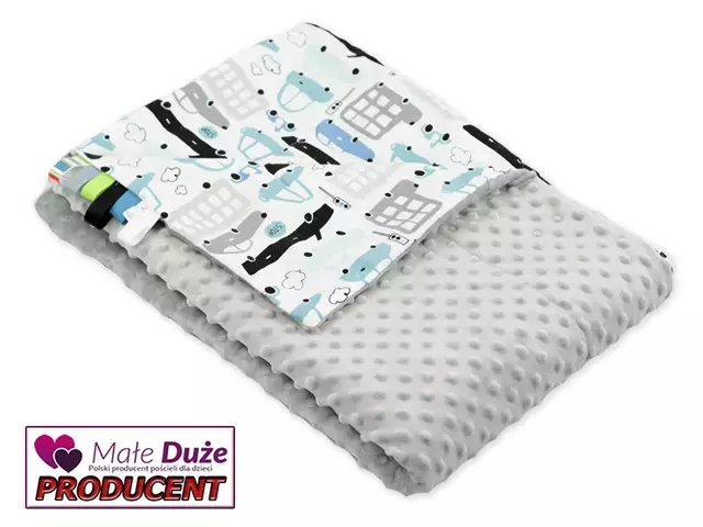 Kocyk 100×135 cm — dwustronny, z dwóch różnych faktur materiału: kolorowa, gęsta bawełna oraz miękka, delikatna dzianina minky o gramaturze 400 g/m². Wypełnienie to antyalergiczna, puszysta włóknina silikonowana o gramaturze 45 g/m².