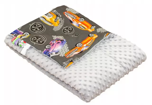 Kocyk 100×135 cm — dwustronny, z dwóch różnych faktur materiału: kolorowa, gęsta bawełna oraz miękka, delikatna dzianina minky o gramaturze 400 g/m². Wypełnienie to antyalergiczna, puszysta włóknina silikonowana o gramaturze 45 g/m².