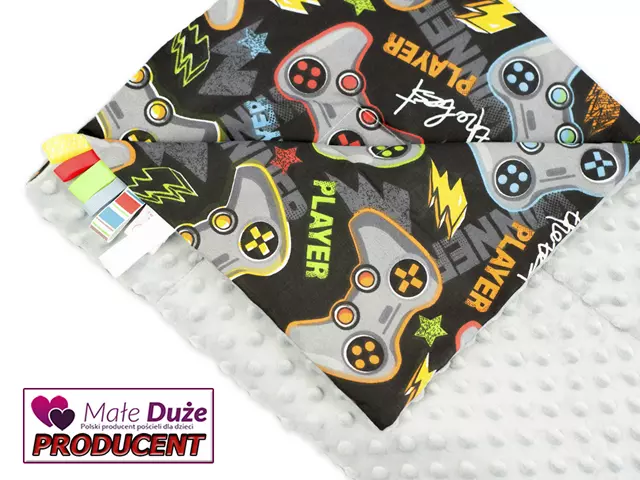 Kocyk 100×135 cm — dwustronny, z dwóch różnych faktur materiału: kolorowa, gęsta bawełna oraz miękka, delikatna dzianina minky o gramaturze 400 g/m². Wypełnienie to antyalergiczna, puszysta włóknina silikonowana o gramaturze 45 g/m².