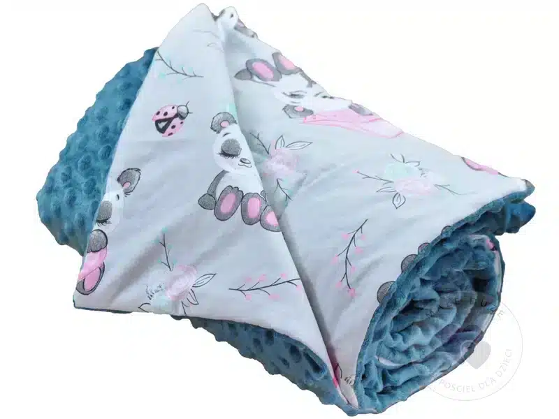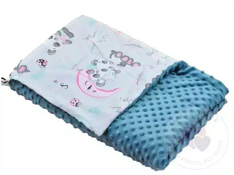 Kocyk 100×135 cm — dwustronny, z dwóch różnych faktur materiału: kolorowa, gęsta bawełna oraz miękka, delikatna dzianina minky o gramaturze 400 g/m². Wypełnienie to antyalergiczna, puszysta włóknina silikonowana o gramaturze 45 g/m².