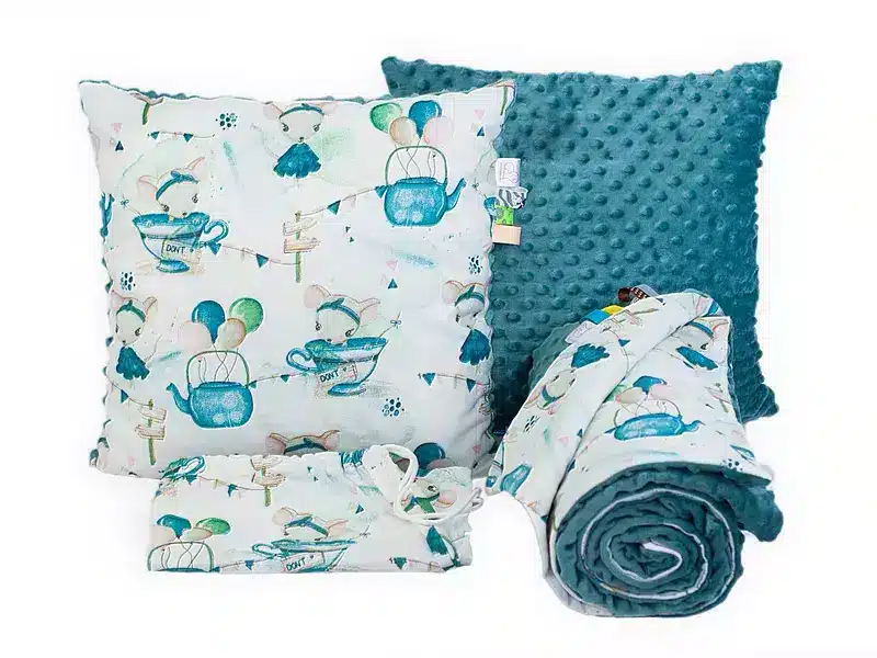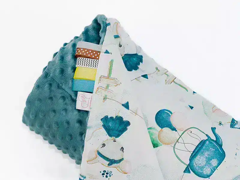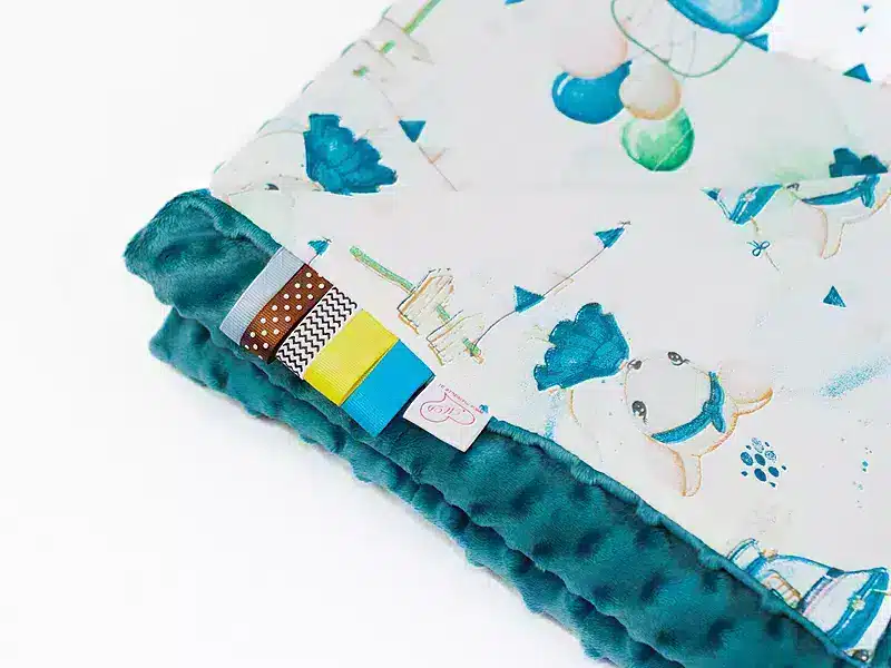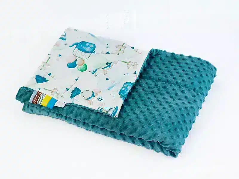 • Kocyk 100×135 cm — dwustronny, z dwóch różnych faktur materiału: kolorowa, gęsta bawełna oraz miękka, delikatna dzianina minky o gramaturze 400 g/m². Wypełnienie to antyalergiczna, puszysta włóknina silikonowana o gramaturze 45 g/m².