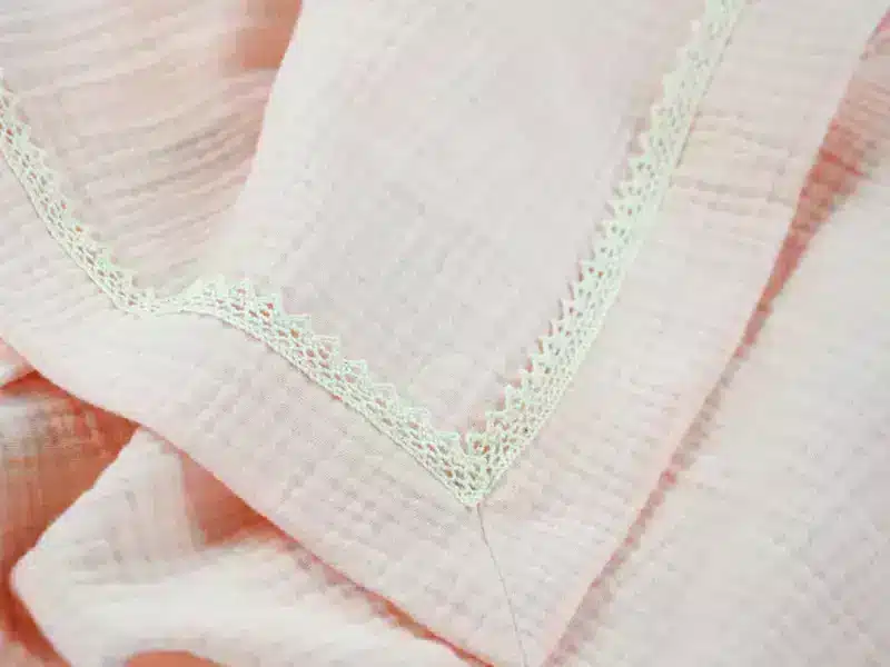 Kocyk muślinowy otulacz obszyty jest bawełnianą, klockową koronką, która nadaje mu niezwykłego uroku. Delikatny, leciutki jak piórko kocyk muślinowy zostanie najlepszym przyjacielem każdego maluszka w letnie, gorące dni.