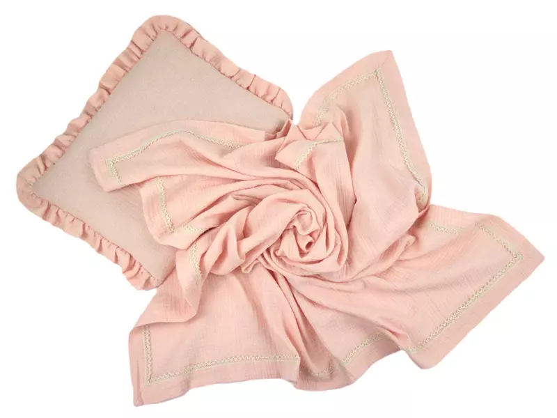 Letnia pościel muślinowa do wózka to niezbędny zestaw każdego maluszka. Zestaw składa się z płaskiej poduszki ozdobionej falbanką oraz delikatnego kocyka otulacza z dekoracyjną bawełnianą koronką.
