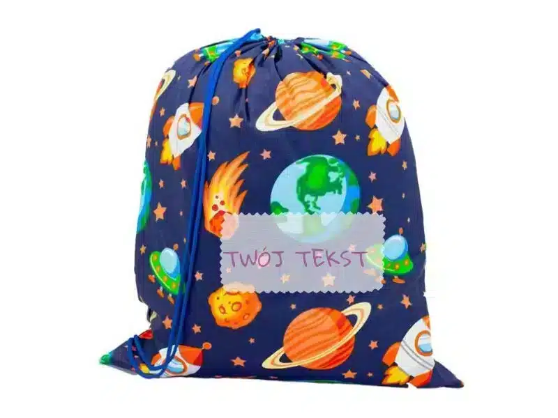 Worek można spersonalizować trwałym haftem wykonanym na specjalnej, białej wstawce tkaniny dopasowanej kolorystycznie do wzoru worka.