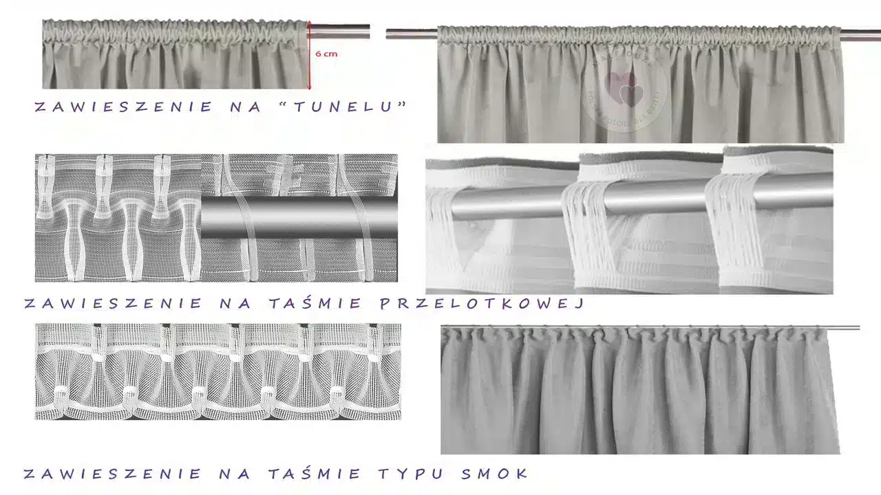 Standardowo nasze zasłony szyjemy z taśmą marszczącą (5 cm), pasującą na żabki lub agrafki. Na życzenie oferujemy również tunel lub taśmę przelotkową – wystarczy podać preferencję przy składaniu zamówienia.